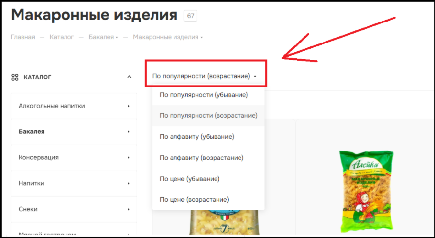- Вы можете отсортировать товары по цене (сначала дешевые или дорогие), по популярности или по алфавиту. Для этого найдите над списком товаров выпадающее меню (рис. 3)